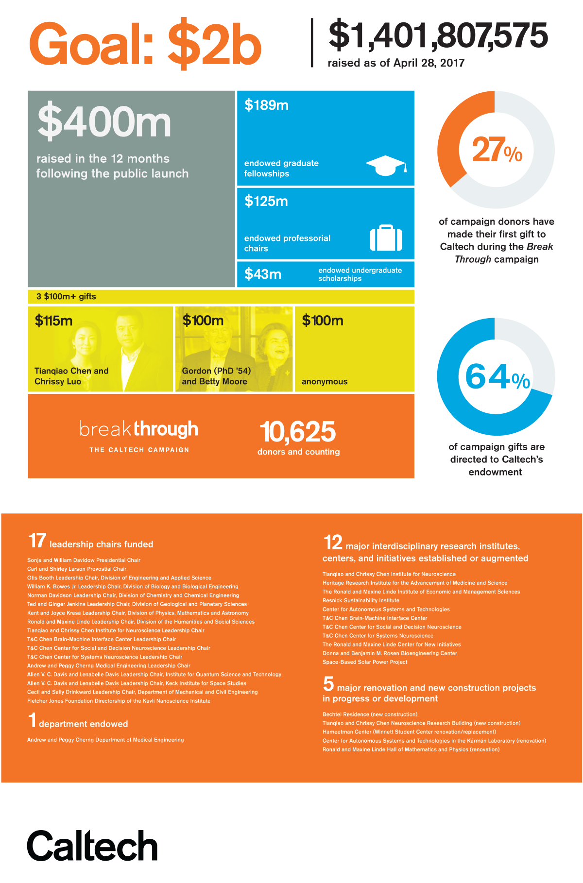 Break Through, publicly launched just over a year ago, is already the most successful campaign in Caltech's history. In the first year of the public phase alone, gifts exceeded $400 million. And total contributions—over $1.4 billion—have surpassed the goal of Caltech's last campaign.