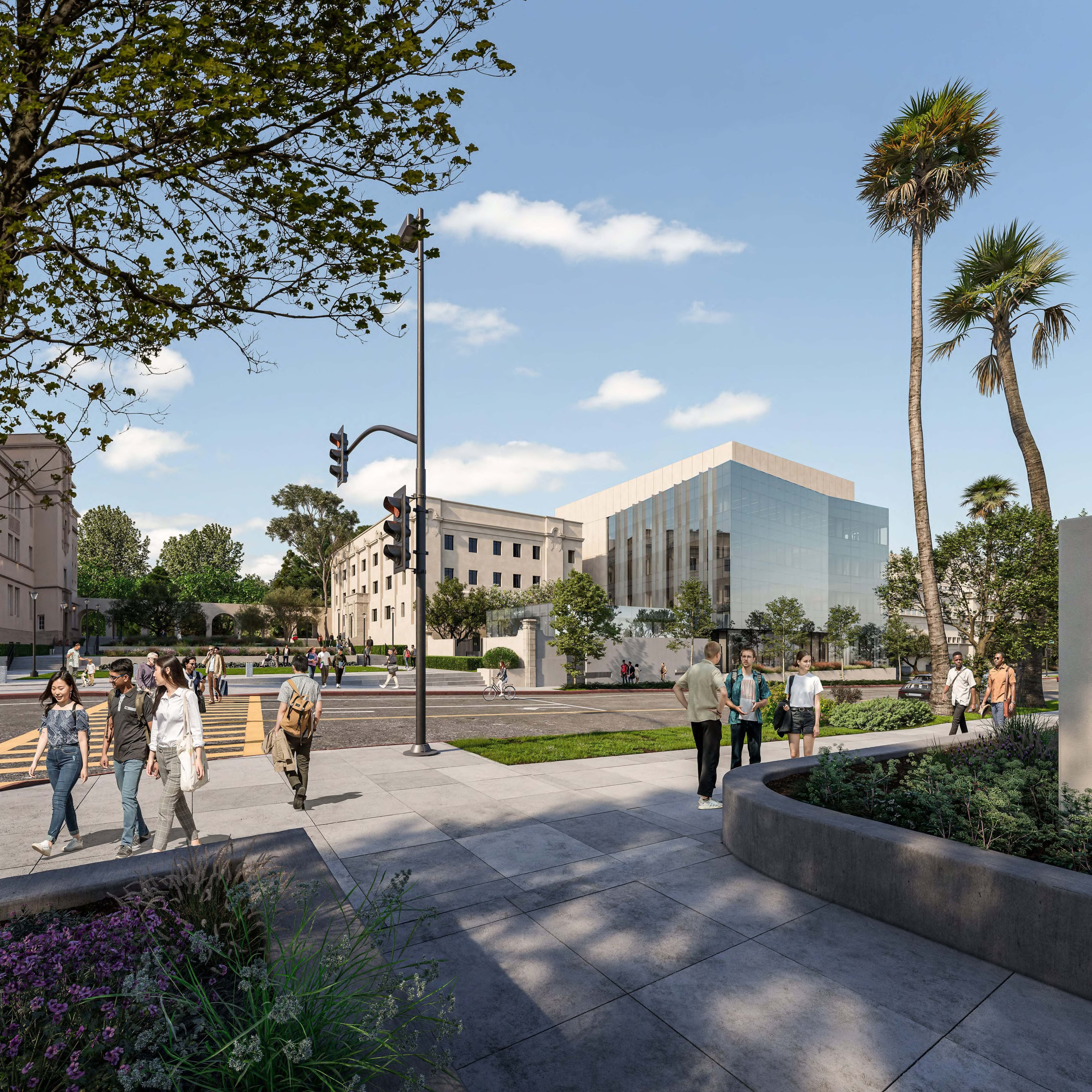 Slated to open in fall 2025, the Ginsburg Center will be located on the north side of California Boulevard, adjacent to Caltech's physics, mathematics, astronomy, and engineering buildings. Transparent façades inflected inward on the center's south and west sides will suggest a prism or the bending of spacetime—an allusion to the research and education that will take place inside. Above ground, four stories comprising nearly 37,500 square feet will encompass research offices as well as a nucleus of collaborative spaces and seminar/meeting rooms infused with natural light.